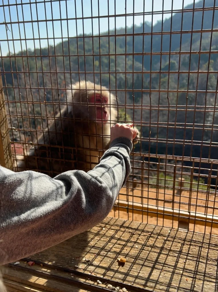 Next we headed to Arashiyama. Here we visited the Monkey Park (it sits at the top of that little mountain with a view of the whole city). There are guides at the top monitoring the monkeys and you can pay a small fee to feed them some fresh fruit from an enclosed space. For the most part, there isn’t much interacting, but the views are worth the hike.